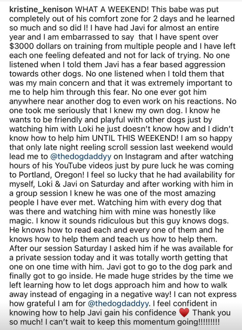 "After working with him in a group session I knew he was one of the most amazing people I have ever met. Watching him with every dog that was there and watching him with mine was honestly like magic. He knows how to read each and every one of them and he knows how to help them and teach us how to help them. I cannot express how grateful I am for The Dog Daddy. I feel confident in knowing how to help Javi gain his confidence ❤️ I can't wait to keep this momentum going!!!!!!!"