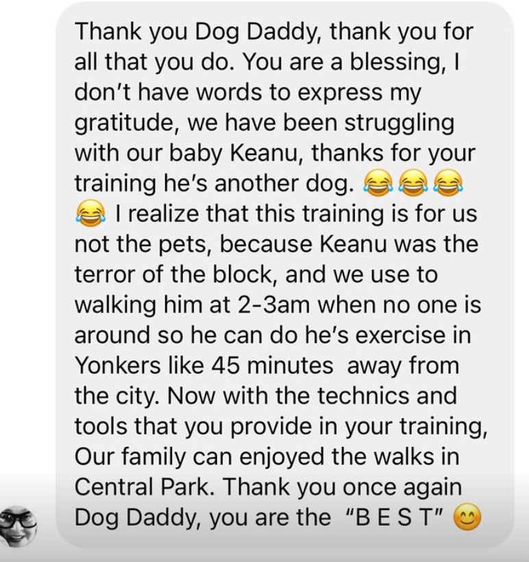 "We have been struggling with our baby Keanu. Thanks to your training he's another dog. Keanu was the terror of the block and we used to walk him at 2-3 am when no one is around in Yonkers 45 minutes away. Now with the techniques and tools you provide in your training, our family can enjoy the walks in Central Park. Thank you once again Dog Daddy, you are the BEST 😊"