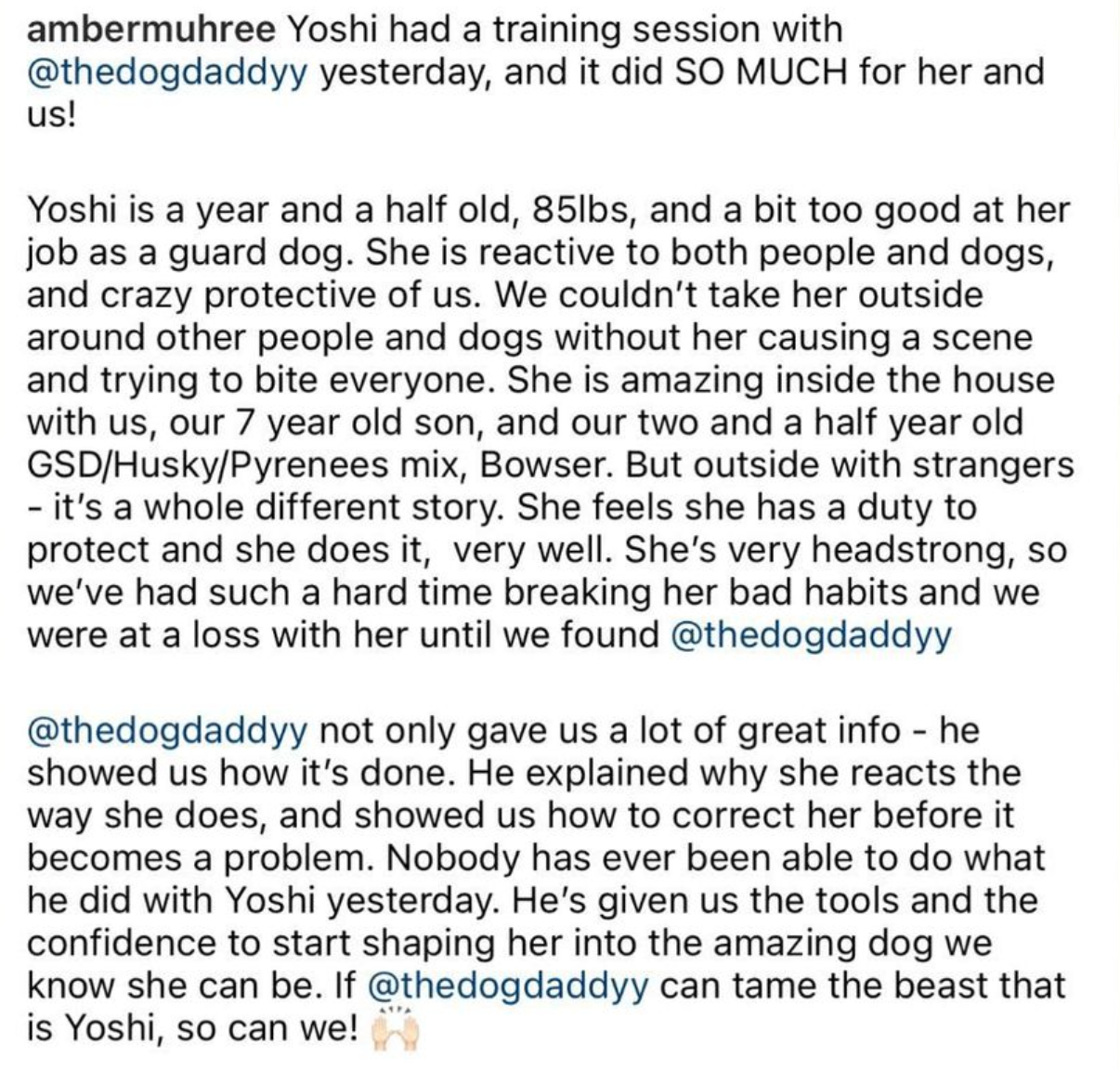 "I highly recommend his class! Just one training has made a huge difference in my dog. I never would have pictured my dog being around so many dogs and distractions but at the end of the class he was able to coexist with everyone. My dog started with a muzzle and left the class without needing one! Thank you @thedogdaddyofficial!"